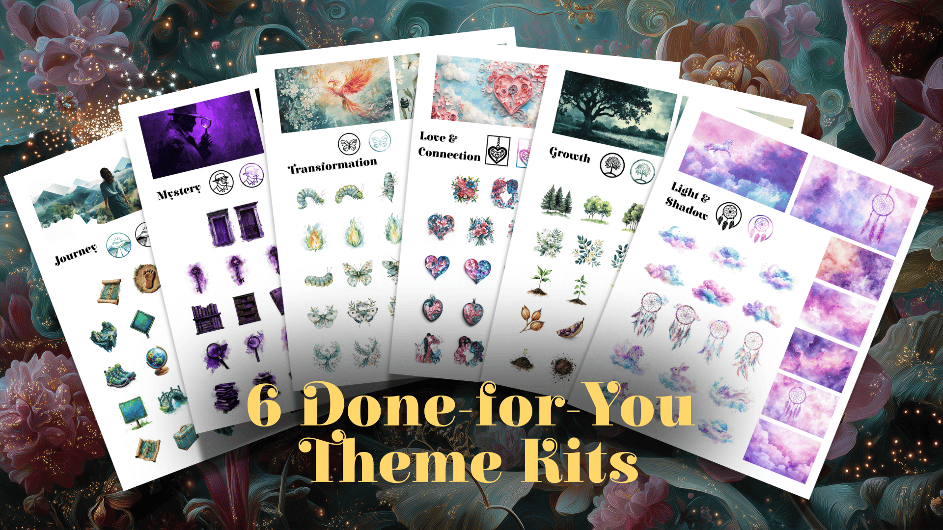 Six enchanting theme kits (like Mystery, Transformation, Growth…) complete with visual background images, icons and artifact images to get you going fast.